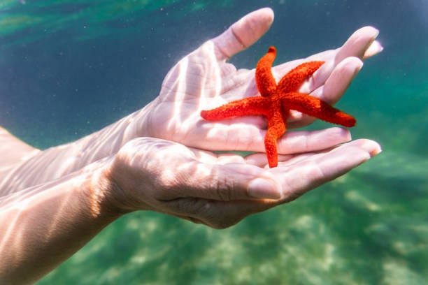 The star is bright as emergency, tangerine stark against a wash of blue that is not the heavens but those sublunar tides that coil below the ocean’s surface. This is not a gaseous giant hung in some distant galaxy. No, it is a fleshy and vulnerable cosmos that slowly suctions its way across the sea floor, embarrassingly removing its own stomach to feed, wrapping its physical appetite around its food in an act closer to hugging than it is to our human conception of eating.